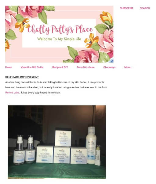 Patricia (aka Chatty Patty) tried and enjoyed Reviva Labs’ Hydrating Skin Care Treatment Regimen Bundle featuring our Cleansing Milk, Soothing Skin Tonic, Collagen Serum, Hyaluronic Acid Serum, and Collagen Night Creme....