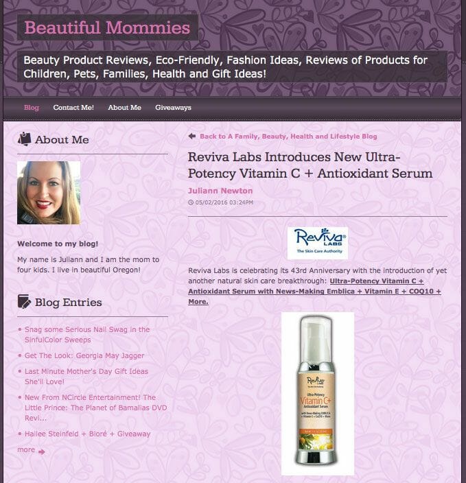 Juliann at Beautiful Mommies knows how important it is to protect her skin from free radical damage, and she was enthusiastic about using Reviva’s new Ultra-Potency Vitamin C+ Antioxidant Serum with Emblica. EMBLICA (from the Indian Gooseberry plant) is the unique ingredient that has additional qualities, different than other antioxidants.