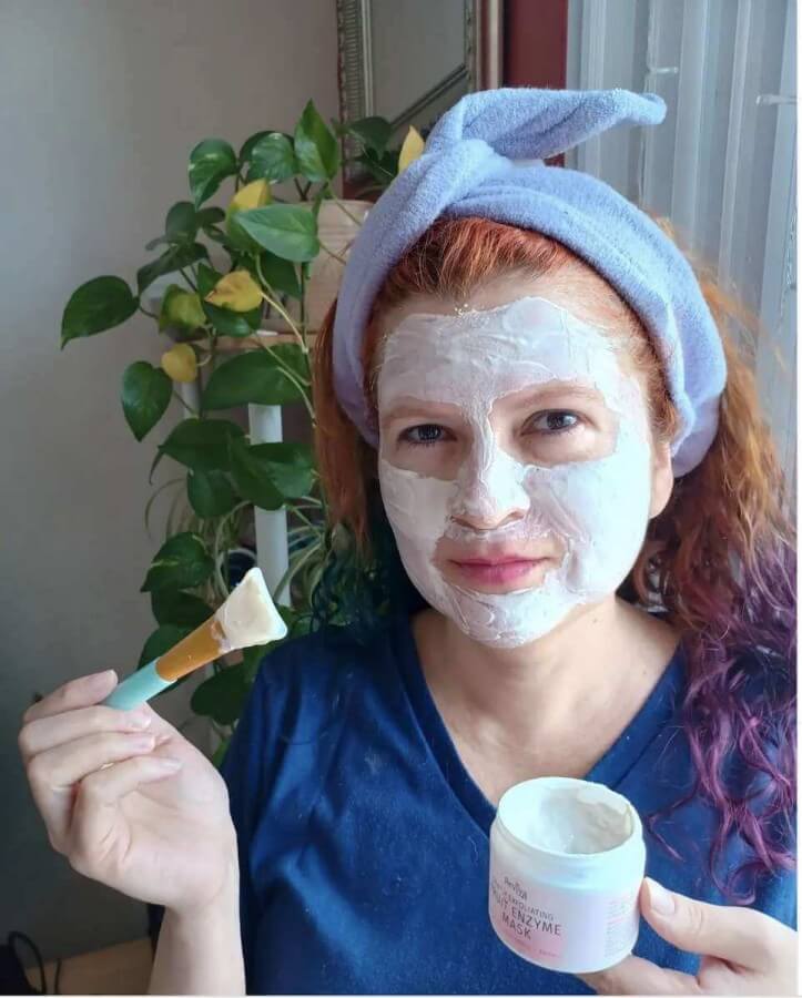 She tried our Gently Exfoliating Fruit Enzyme Mask to start her self-care routine. The mask is meant to help dissolve dead skin cells and help improve your overall complexion. Kat also said that there was no dryness or skin tightness, and most importantly it left her skin glowing.