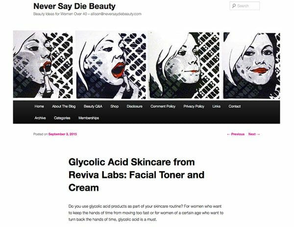 Never Say Die Beauty‘s Allison has enjoyed using Reviva’s Glycolic Acid Toner and 5% Glycolic Acid Cream for over a month – she finds the products gentle, non-irritating, and effective. She’s “addicted” to the toner, and loves the lightweight feel of the cream.
