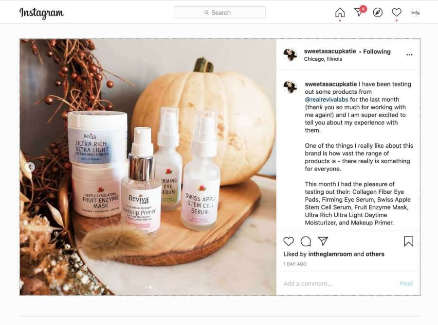 CupKatie Beauty (@sweetasacupkatie) – ?Chicago // #chicagobeautyblogger ?♀️Luxury beauty + skincare reviews. She had the pleasure of testing out Reviva’s: Collagen Fiber Eye Pads, Firming Eye Serum, Swiss Apple Stem Cell Serum, Fruit Enzyme Mask, Ultra Rich Ultra Light Daytime Moisturizer, and Makeup Primer.