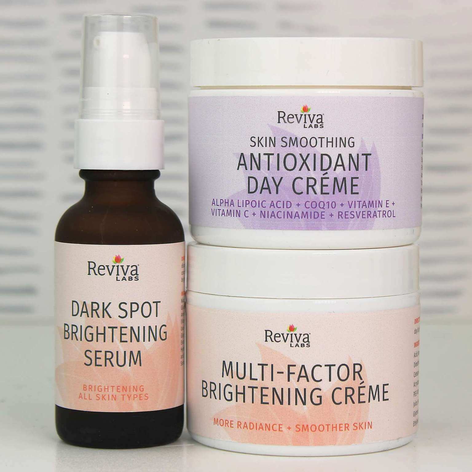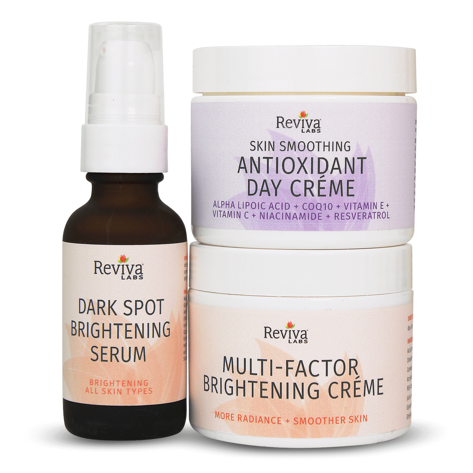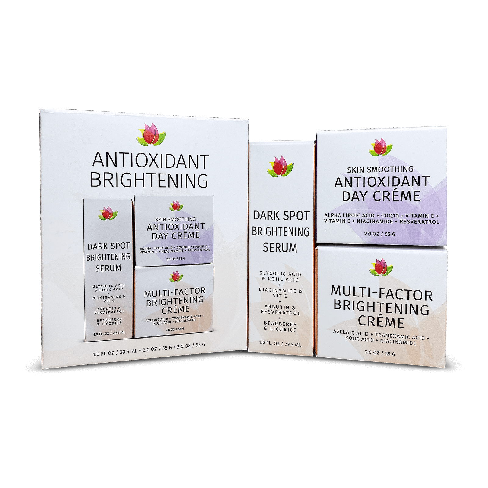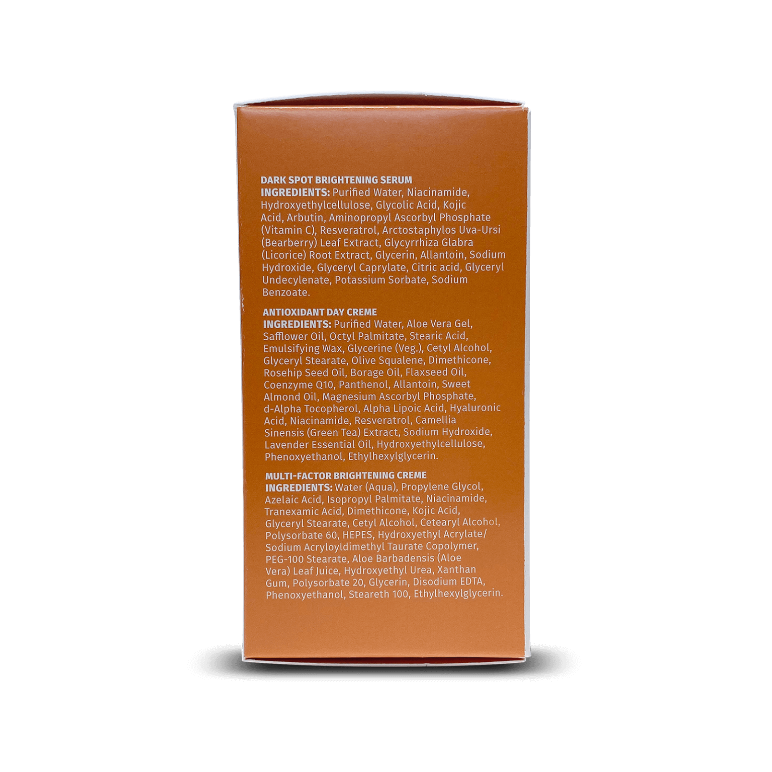 How to Combine: Use AM and PM: After cleansing, apply Dark Spot Brightening Serum and allow to absorb. In the AM apply our Antioxidant Day Creme and follow-up with Sunscreen. In the PM after your serum, apply our Multi-Factor Brightening Creme. Or see individual products.