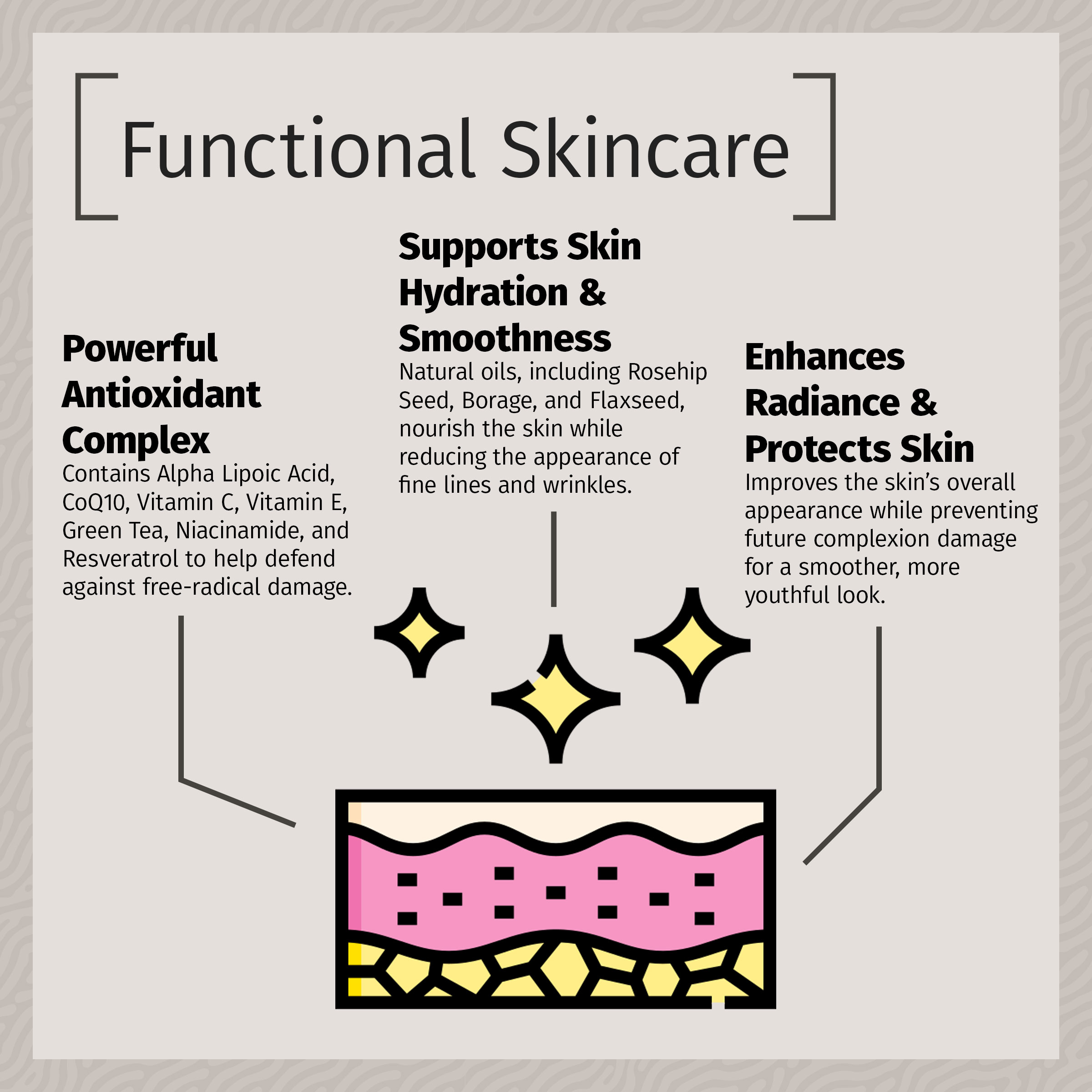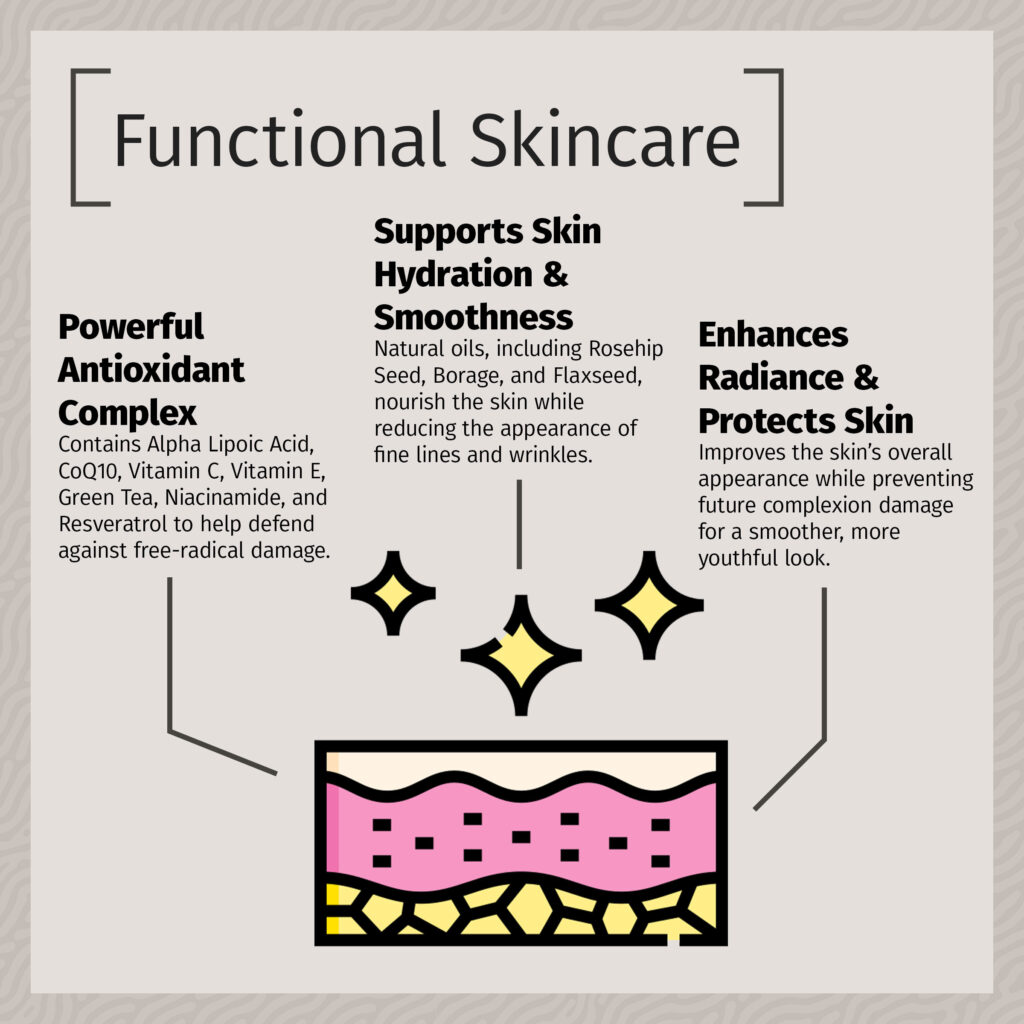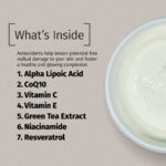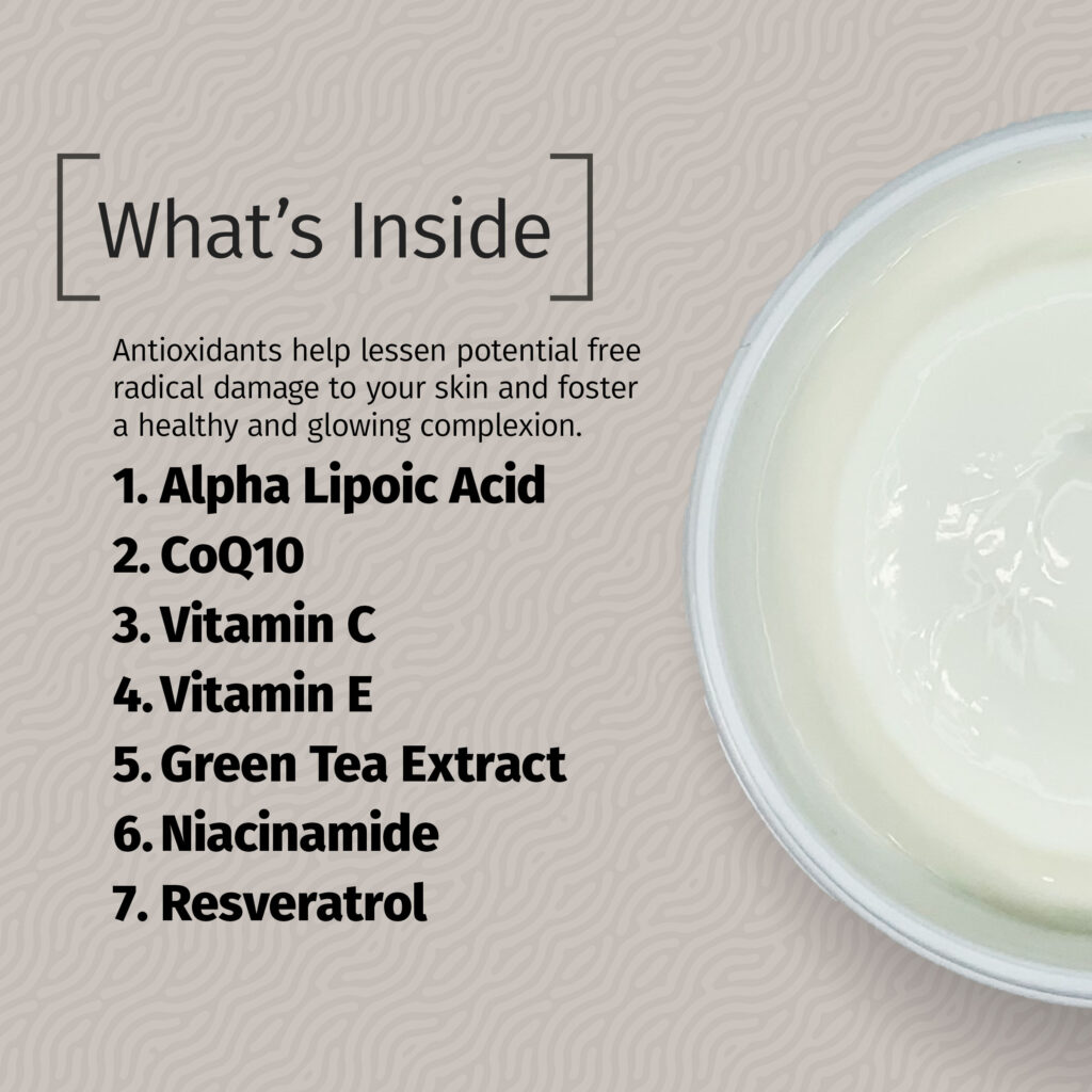 Nourishing antioxidant blend with Alpha Lipoic Acid, CoQ10, Vitamins C & E, Niacinamide, and Resveratrol