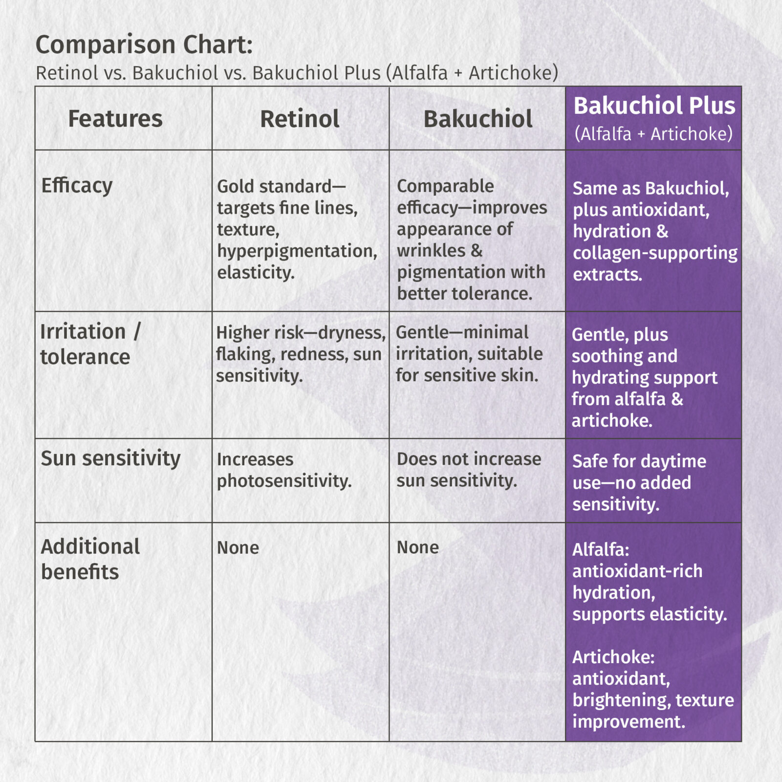 Bakuchiol, a natural retinol alternative, targets fine lines & wrinkles and sun damage, while it hydrates – perfect for sensitive skin. Used for millennia in Ayurvedic, Chinese, and Tamil medicine