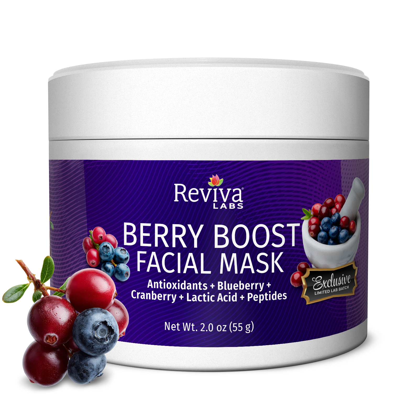 Reviva Labs Berry Boost Facial Mask is a rejuvenating treatment that energizes and renews tired, dull skin. Packed with antioxidant-rich Blueberry and Cranberry extracts, this creamy formula helps brighten and protect against environmental stress. Lactic Acid provides gentle exfoliation, helping to smooth texture and soften fine lines without irritation.