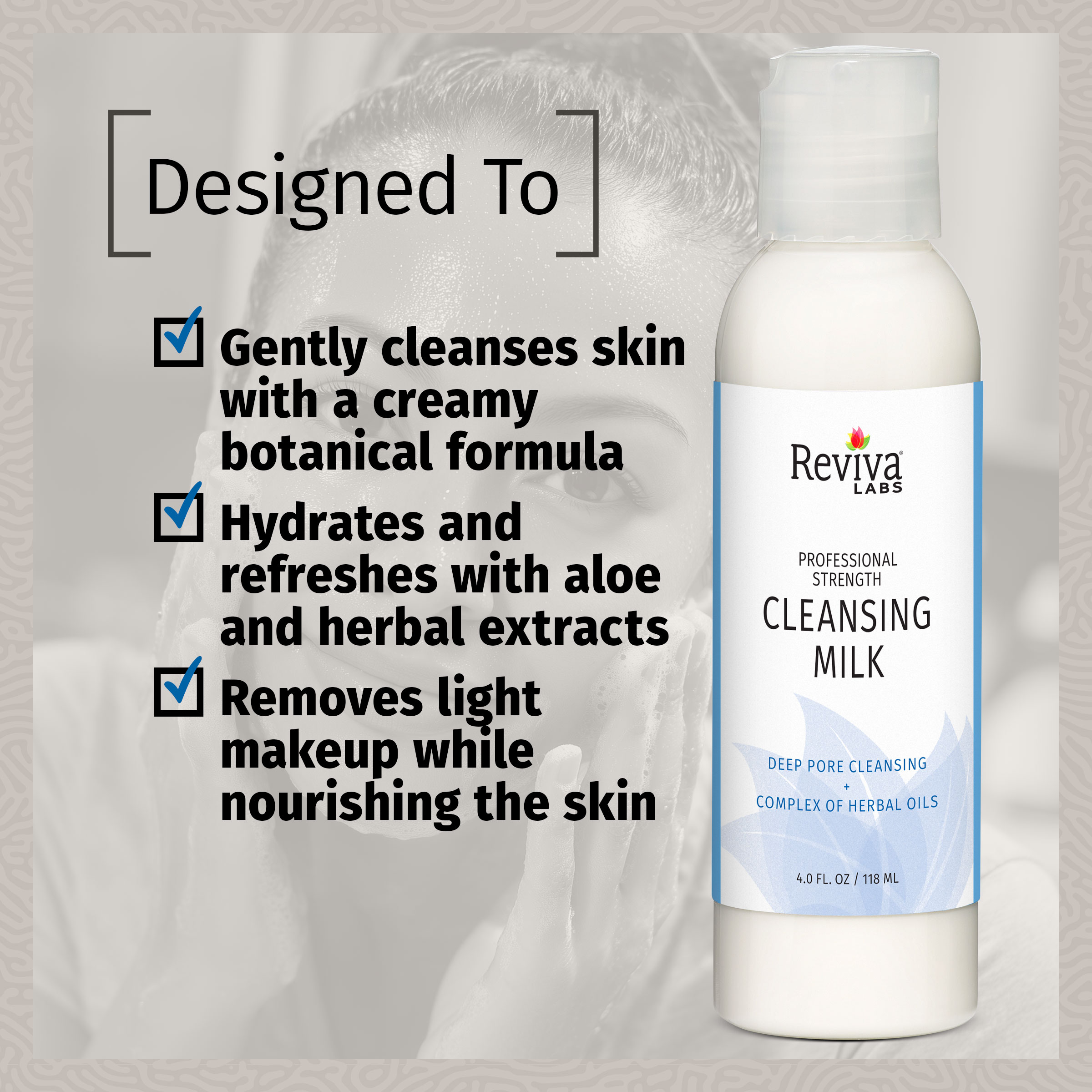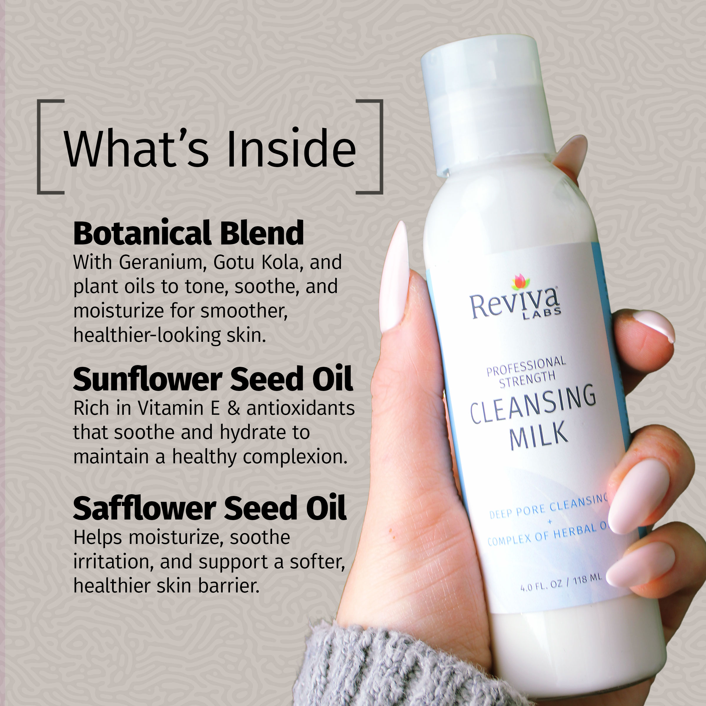 Reviva Labs’ Cleansing Milk is a gentle, botanical-rich formula that purifies without harshness. Enriched with aloe vera and a blend of soothing plant extracts like Gotu Kola, dandelion, and horsetail, it works to lift away daily impurities and makeup while leaving skin feeling fresh, soft, and moisturized. Ideal for dry, sensitive, or mature skin, this creamy cleanser supports a comfortable, balanced complexion—day or night.