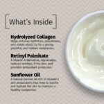 Water, Stearic Acid, Cetearyl Alcohol, Helianthus Annuus (Sunflower) Seed Oil, Isopropyl Lanolate, Hydrolyzed Collagen, Persea Gratissima (Avocado) Oil, Prunus Amygdalus Dulcis (Sweet Almond) Oil, Glyceryl Stearate, Vitamin E, Jojoba Esters, Oleyl Alcohol, Helianthus Annuus (Sunflower) Seed Wax, Dioscorea Villosa (Wild Yam) Root Extract, Sodium Stearoyl Glutamate, Glycine Soja (Soybean) Sterols, Retinyl Palmitate (Vitamin A), Cholecalciferol (Vitamin D3), Polyglycerin 3, Phenoxyethanol, Ethylhexylglycerin.