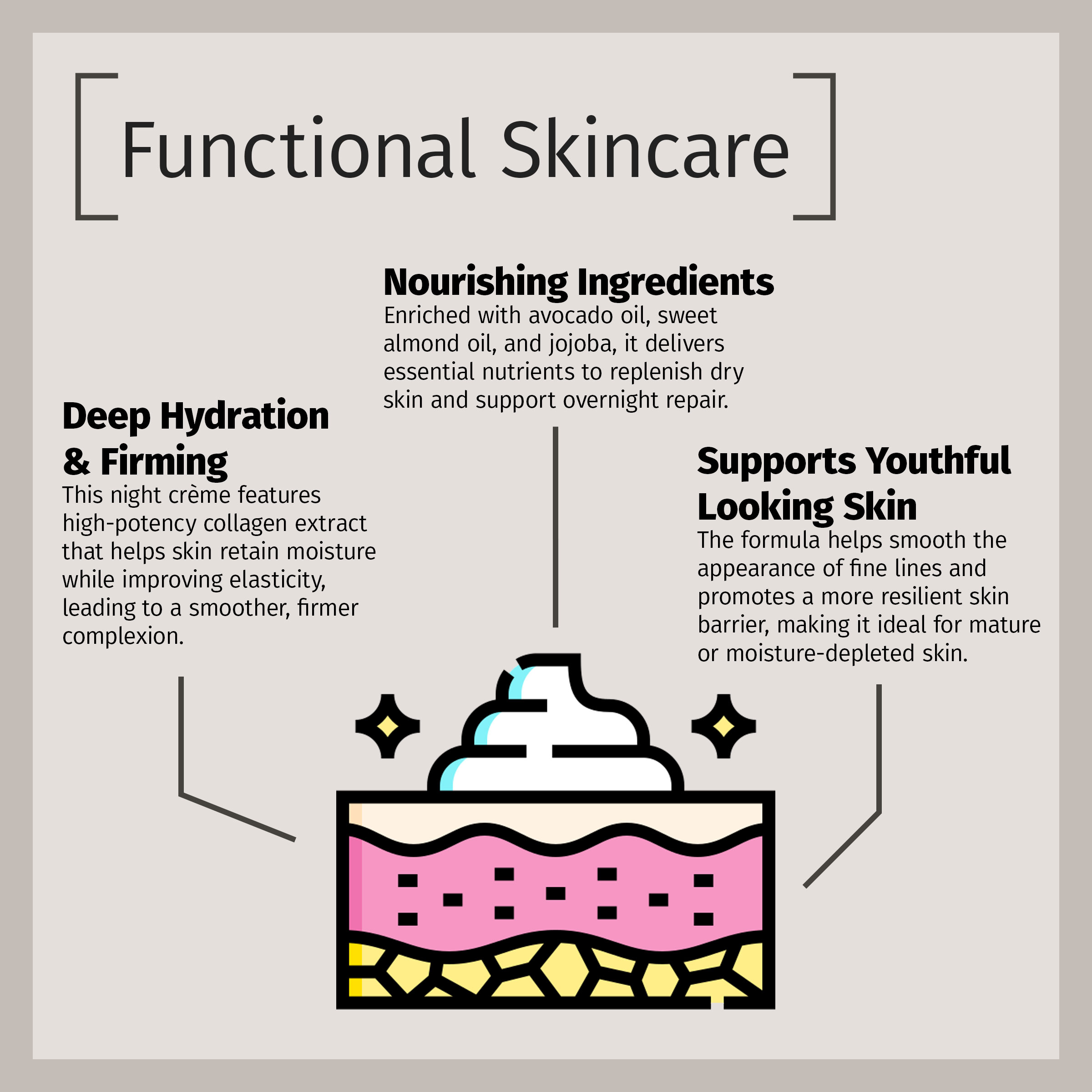 Collagen-rich skincare products help stimulate the body’s collagen synthesis helping to reduce the visible signs of aging. Collagen also supports the skin’s resilience and structure to help your skin look more radiant complexion. For superior firming support, we recommend alternating Collagen Night Crème with Elastin + DMAE Night Crème.