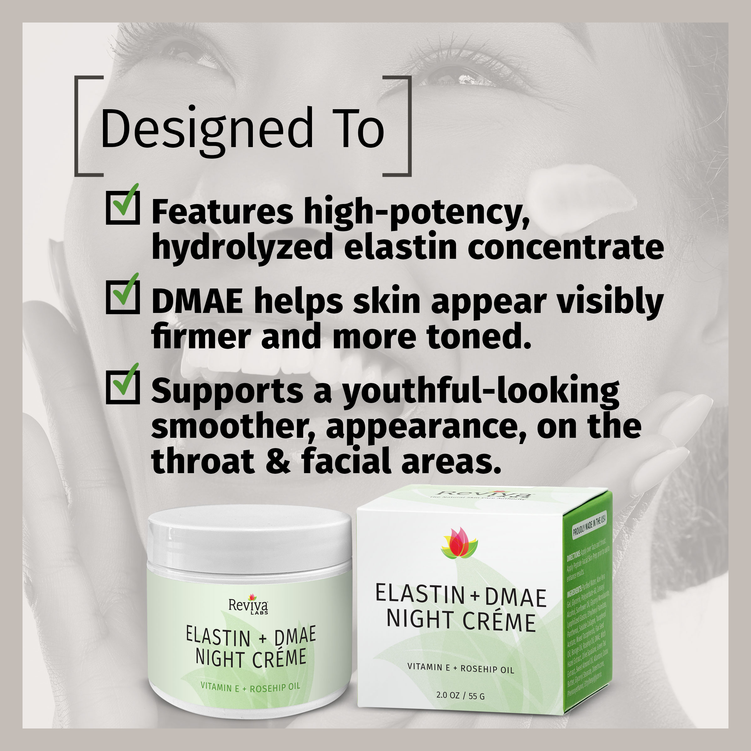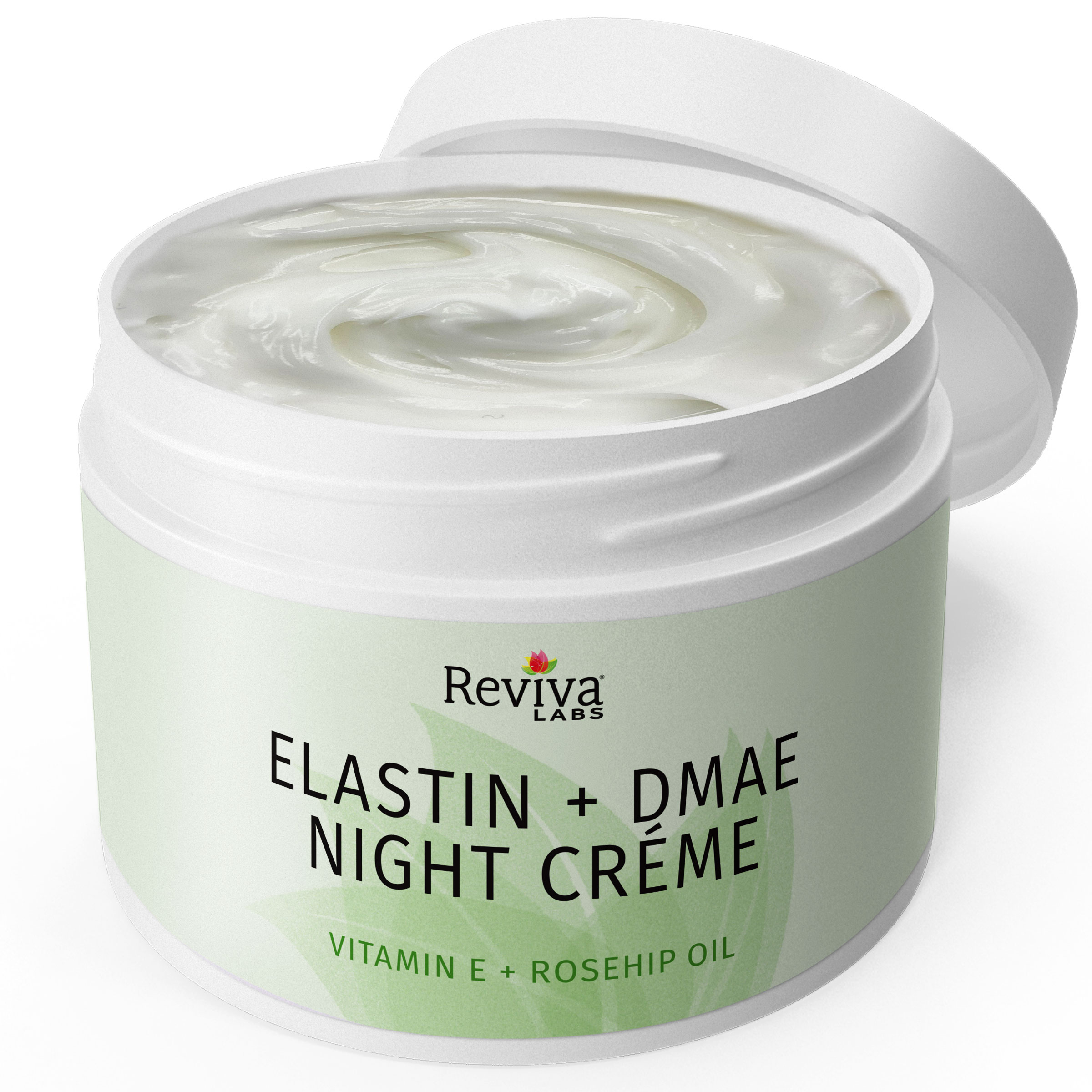 Reviva Labs’ Elastin + DMAE Night Crème combines two appearance-boosting ingredients – hydrolyzed elastin and DMAE – to help support visibly firmer, smoother-looking skin. This rich, nighttime formula is ideal for use on the face and throat, where skin can begin to show signs of slackness. For best results, alternate every two weeks with Reviva’s Collagen Night Crème to support a more balanced, youthful-looking complexion.
