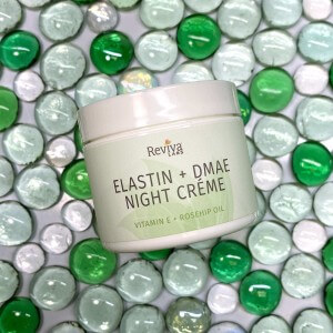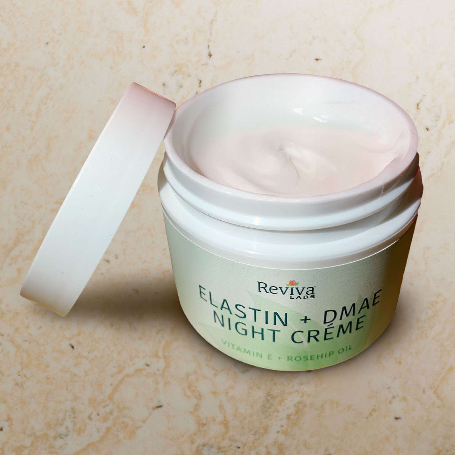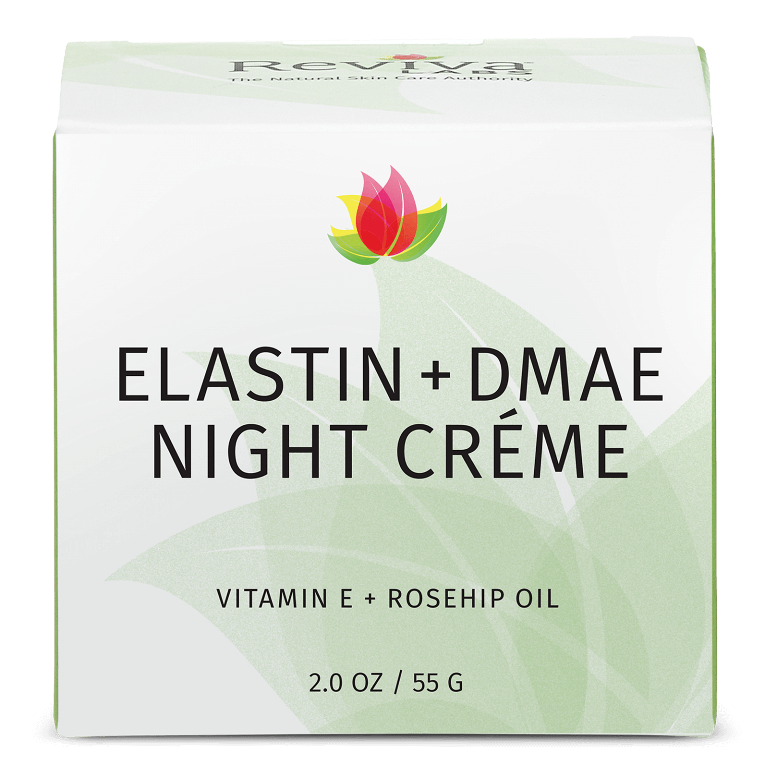 Reviva Labs’ Elastin + DMAE Night Crème combines two appearance-boosting ingredients – hydrolyzed elastin and DMAE – to help support visibly firmer, smoother-looking skin. This rich, nighttime formula is ideal for use on the face and throat, where skin can begin to show signs of slackness. For best results, alternate every two weeks with Reviva’s Collagen Night Crème to support a more balanced, youthful-looking complexion.