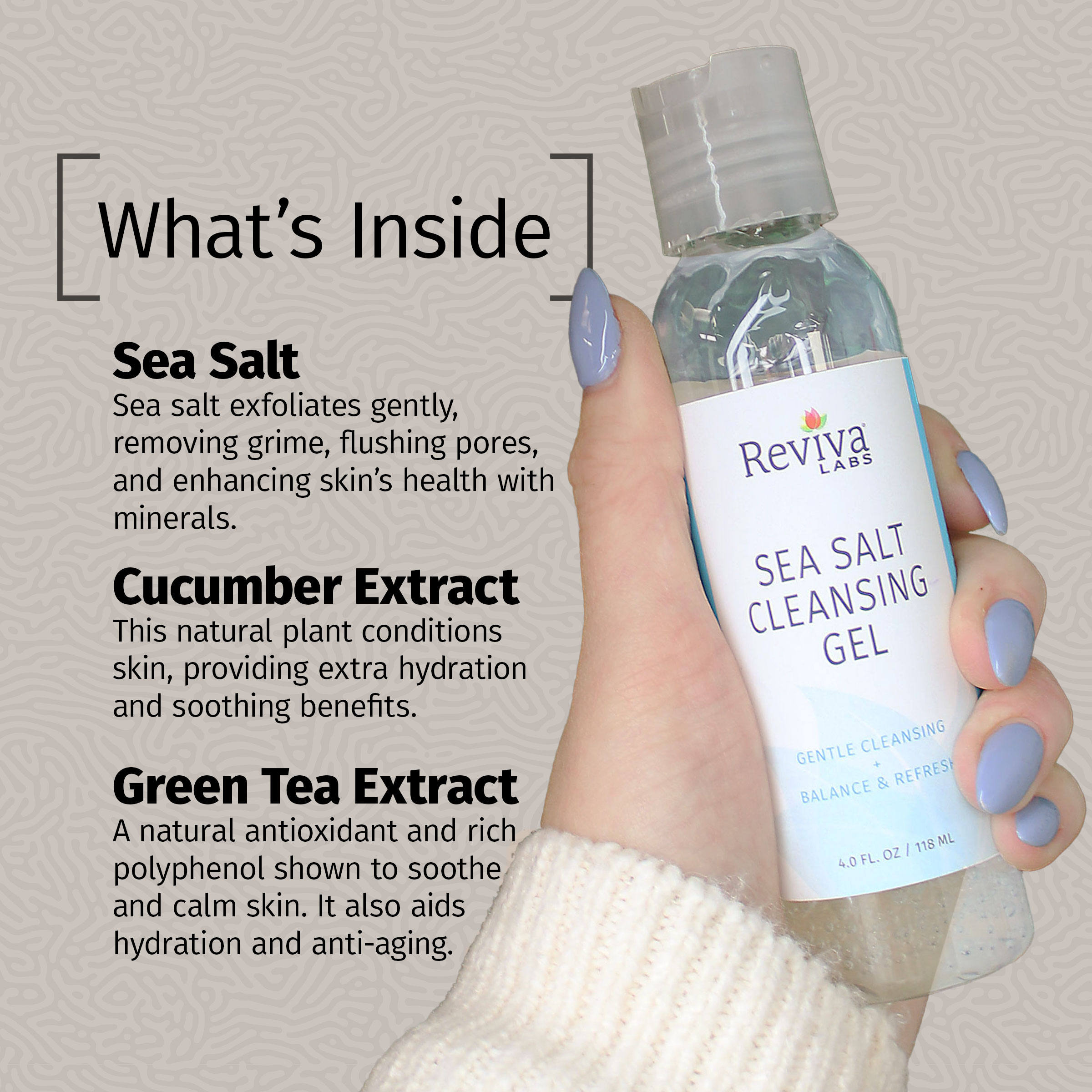 Reviva’s gentle, soothing cleansing gel helps calm and cleanse your face with surfactants used in baby shampoos and naturally antiseptic sea salt. Your skin is left feeling clean and refreshed. No harsh stripping of your natural oils. Instead washing your face each day feels like a luxurious day at the beach with a delightfully tingly afterglow of an ocean mist.