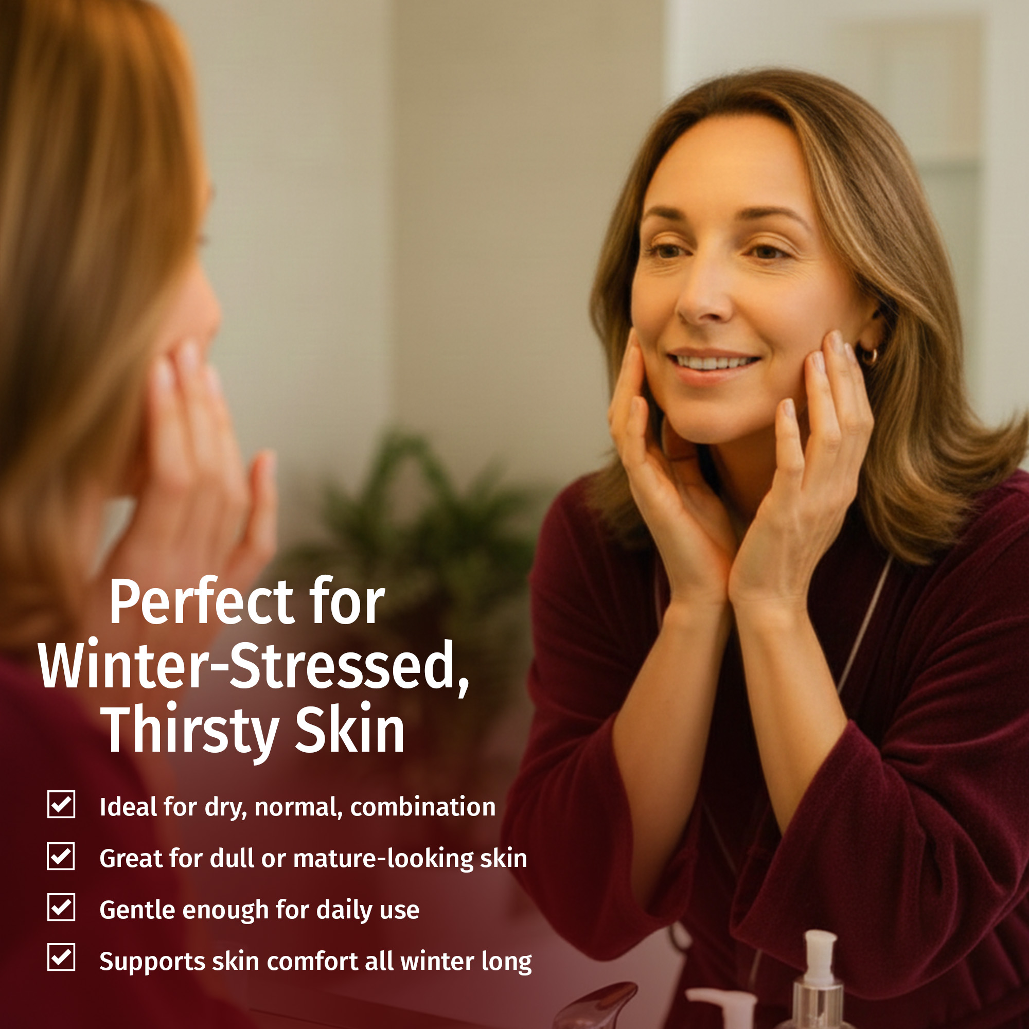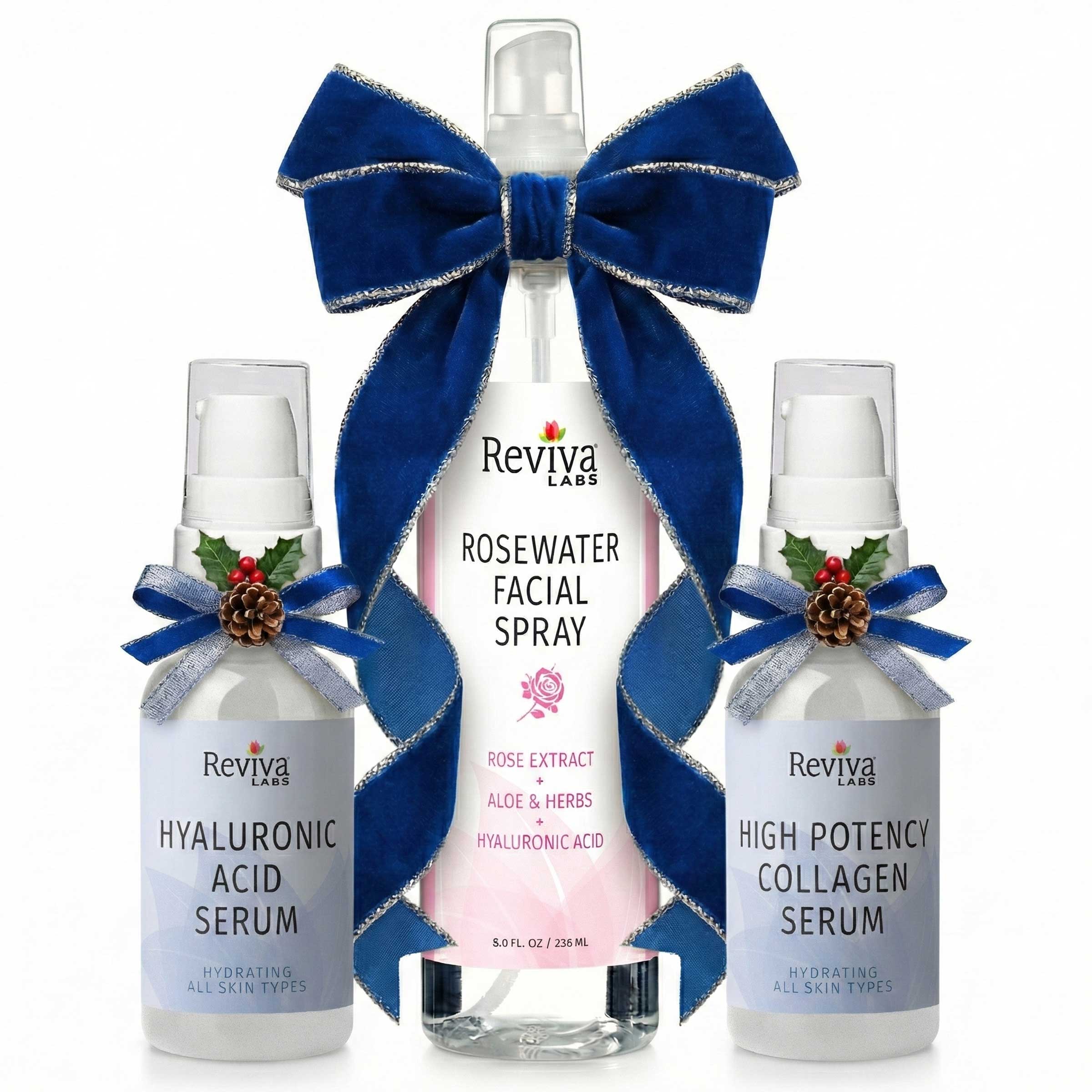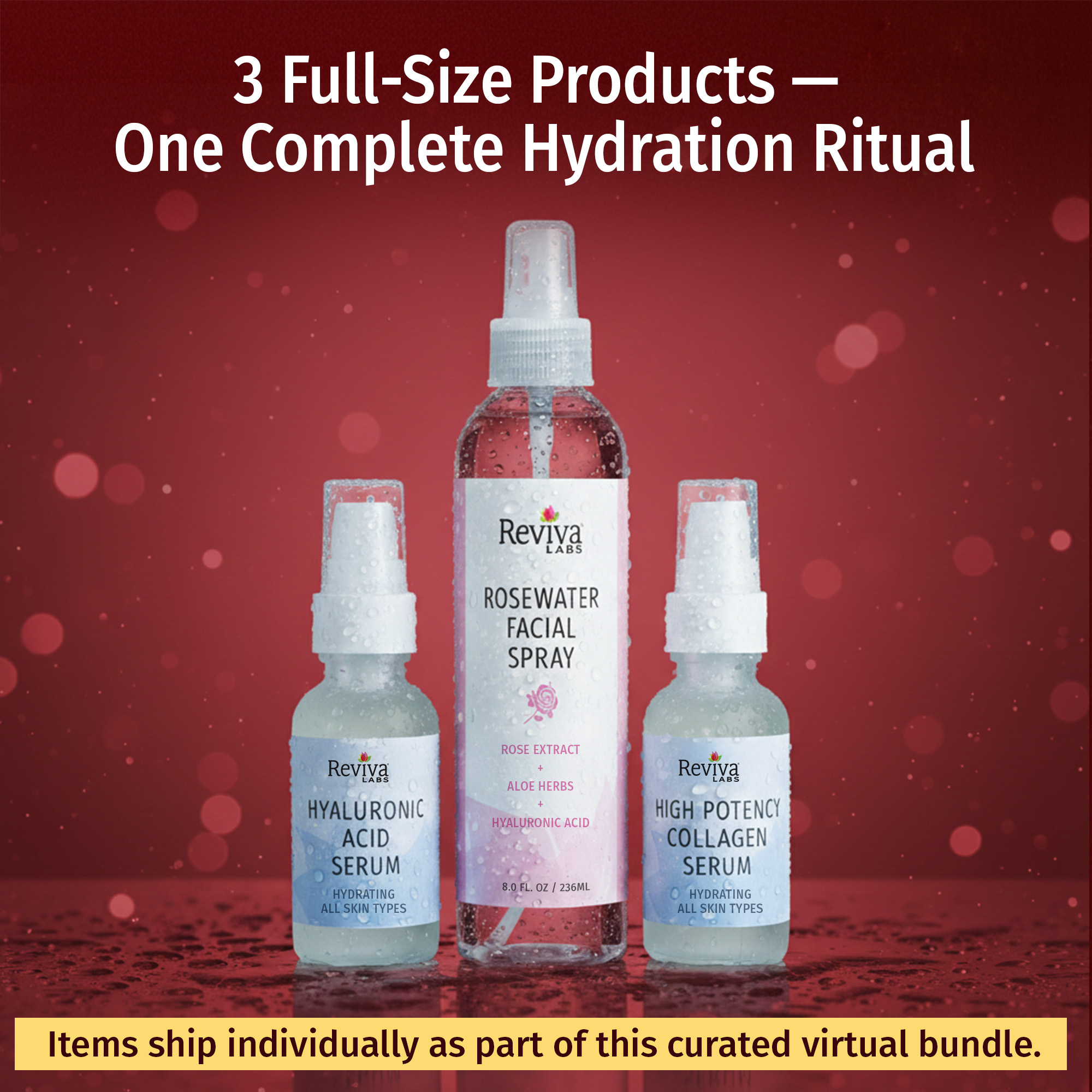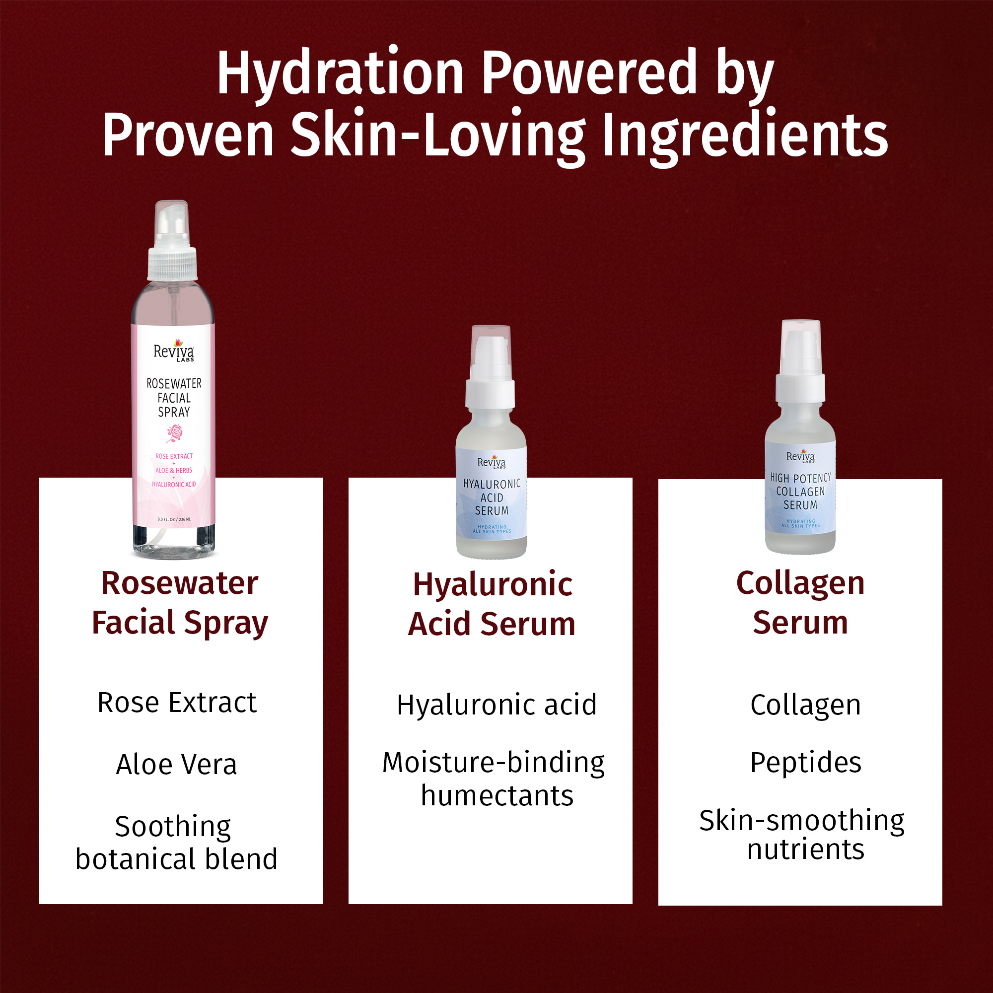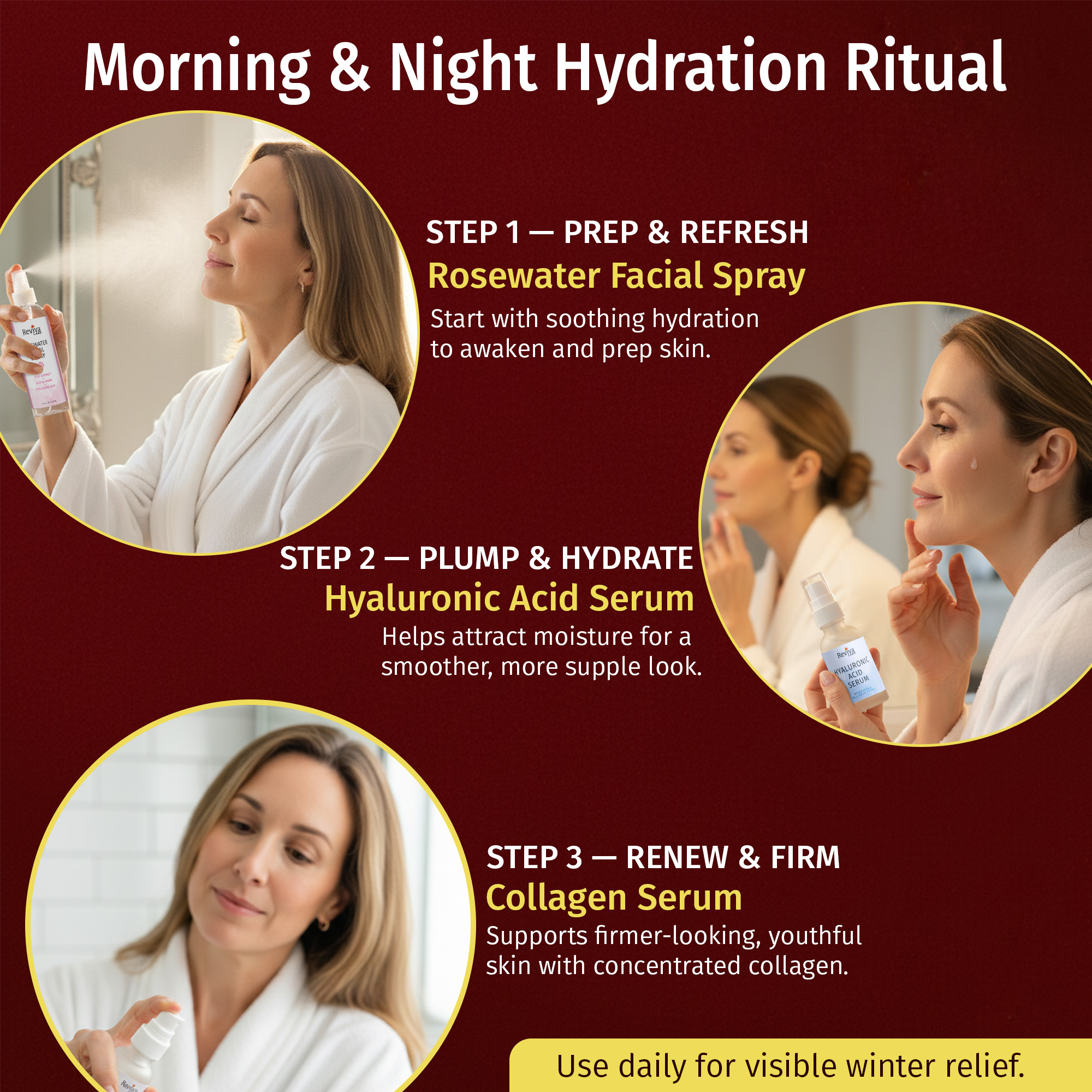 Boost moisture and comfort from morning to night. Hyaluronic Acid Serum replenishes water reserves, Collagen Serum smooths texture, and Rosewater Mist adds a refreshing finish that keeps skin soft and dewy.