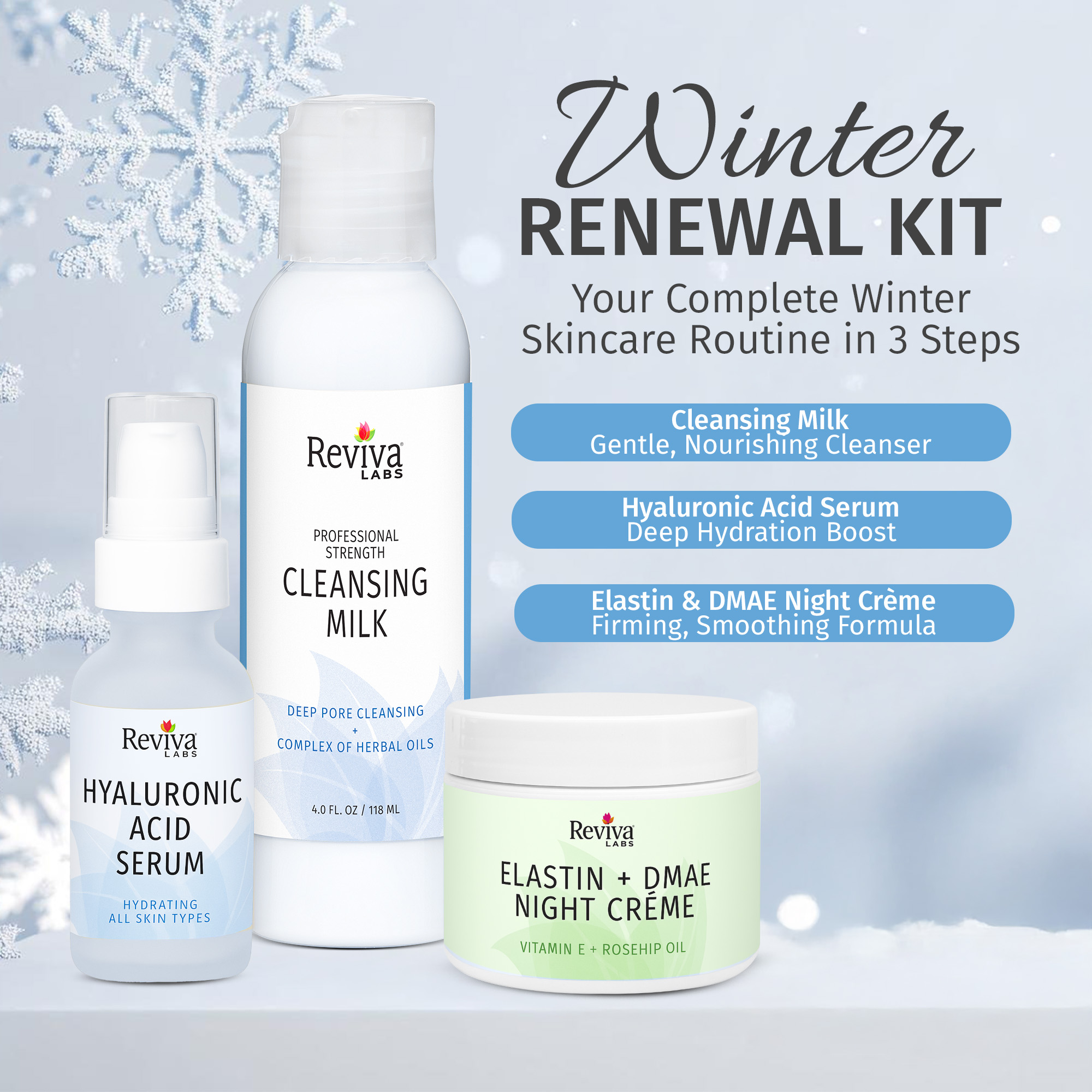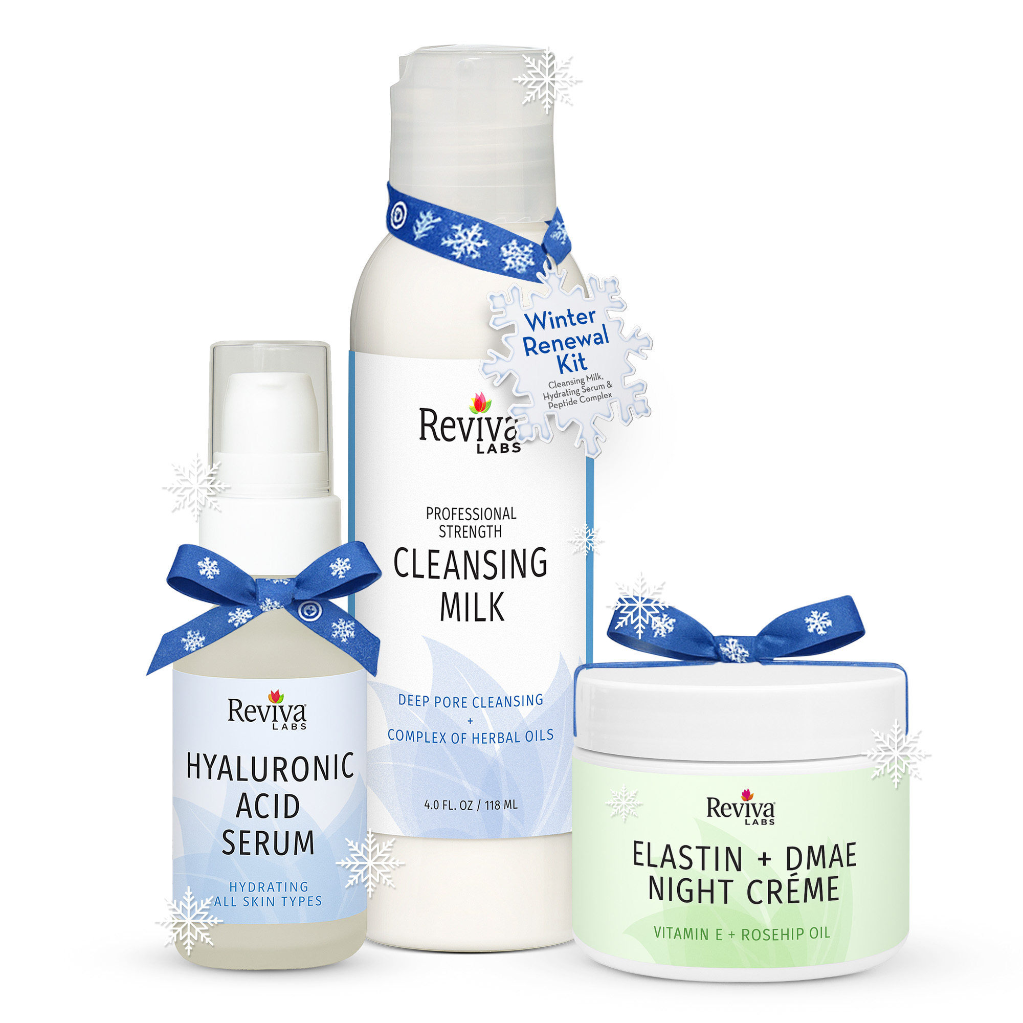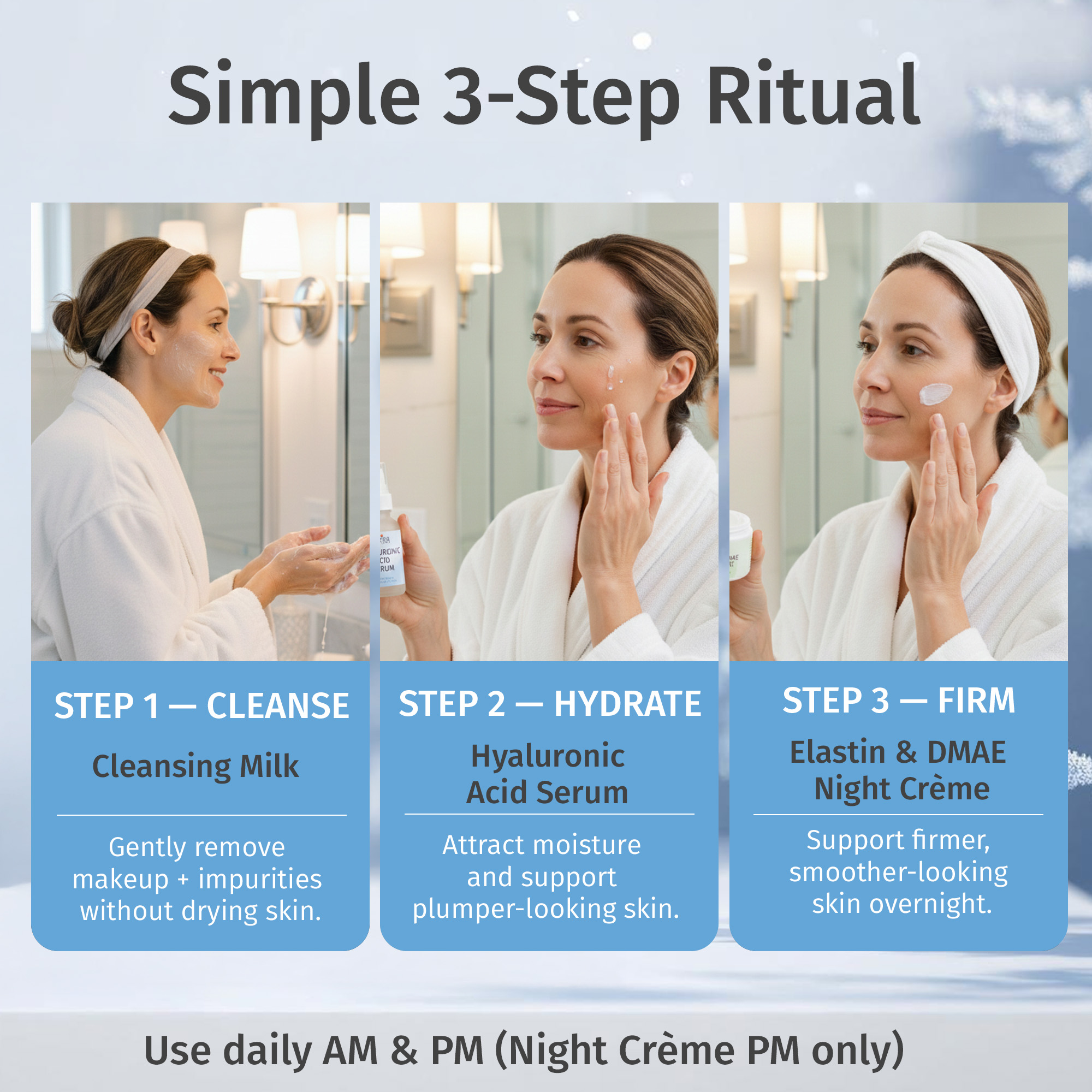 This restorative set cleanses gently, replenishes lost hydration, and repairs overnight. Cleansing Milk sweeps away impurities, Hyaluronic Acid Serum locks in moisture, and our DMAE Night Crème firms and nourishes while you sleep.