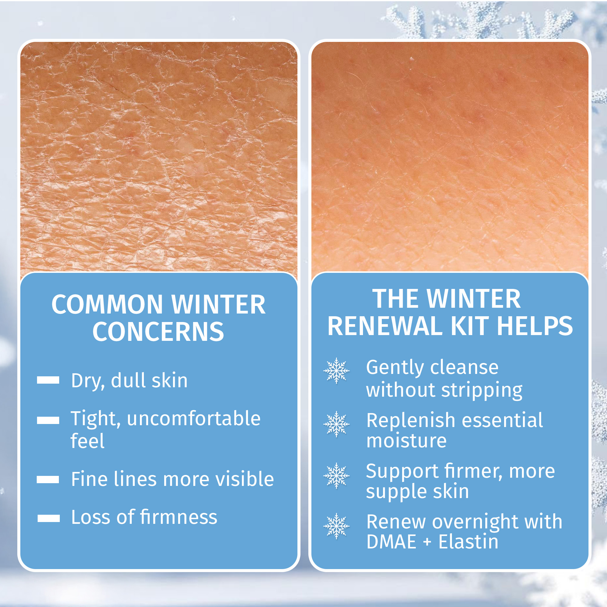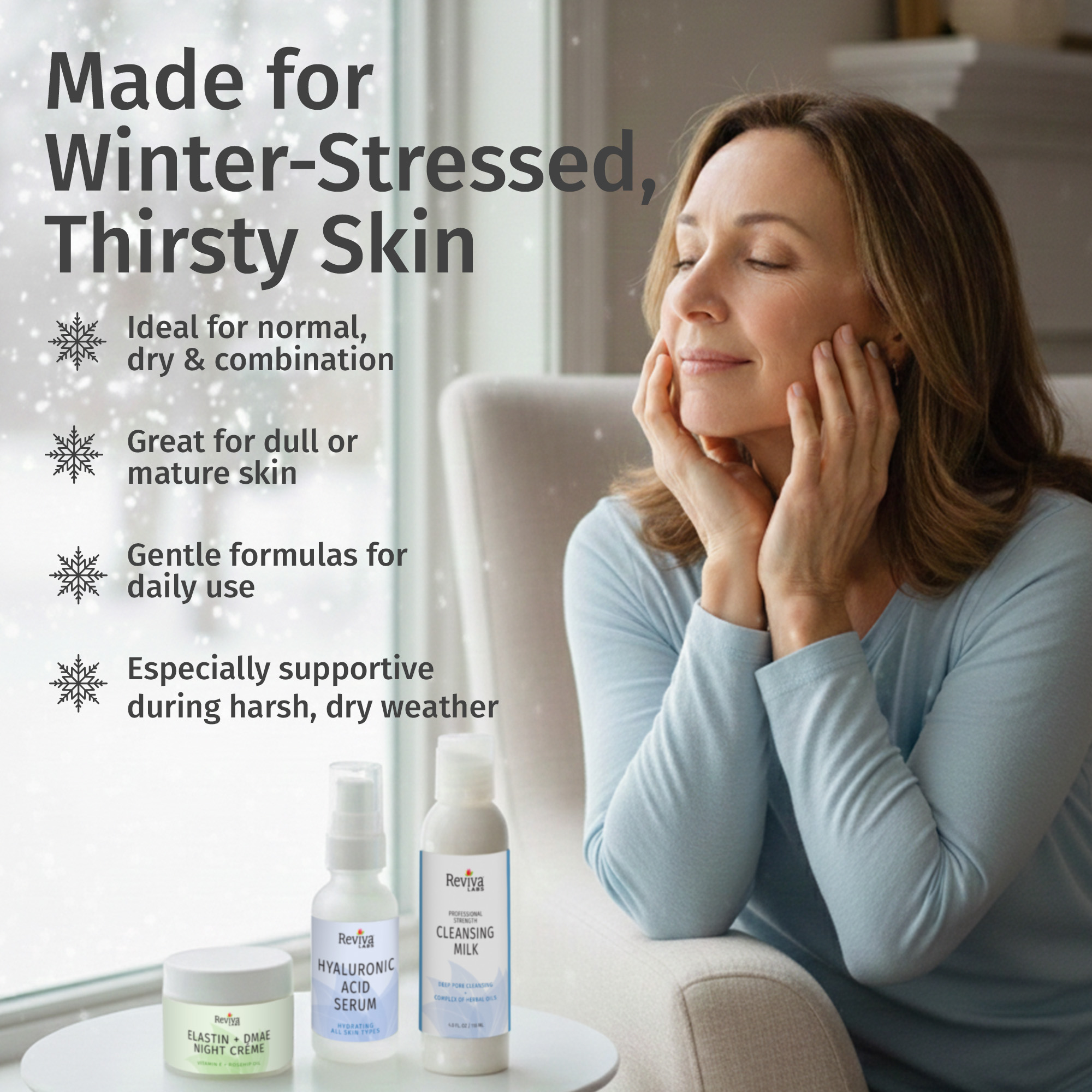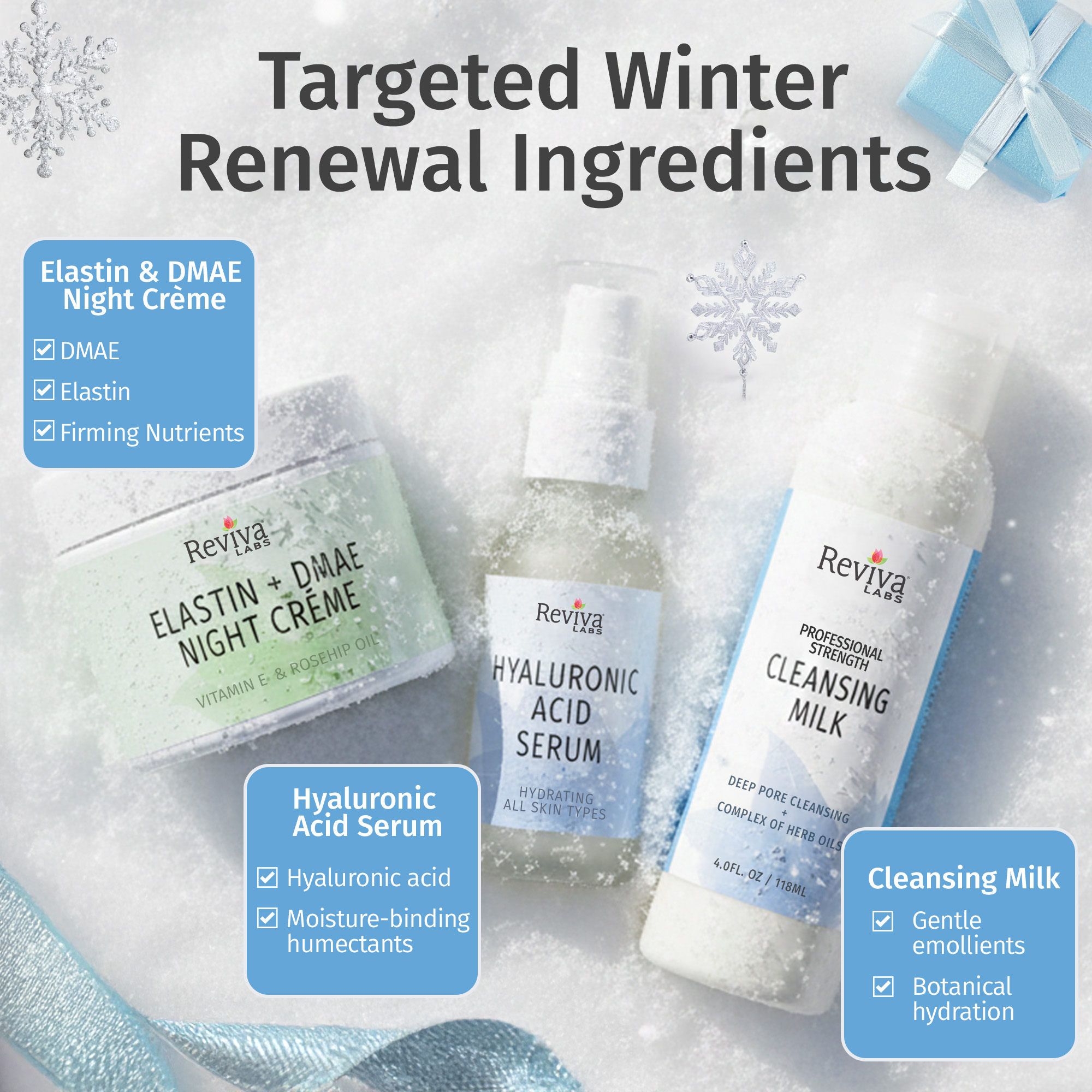 This restorative set cleanses gently, replenishes lost hydration, and repairs overnight. Cleansing Milk sweeps away impurities, Hyaluronic Acid Serum locks in moisture, and our DMAE Night Crème firms and nourishes while you sleep.